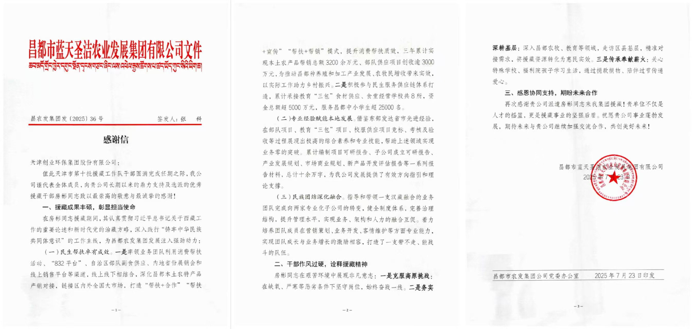 “倾心助国企 真心相助暖人心”,在雪域高原奋斗的岁月里,房彬光荣地加入了中国,实现了身份与思想的双重升华,以实际行动为这片土地贡献了智慧与力量。今年,当房彬即将启程离藏的时候,他收获了这样一面锦旗。昌都市蓝天圣洁农业发展集团有限公司在给创业环保集团的感谢信中写道:“在房彬同志期间,其认真贯彻关于工作的重要论述和新时代党的治藏方略,深入践行铸牢中华民族共同体意识”的工作主线,为昌都农发集团发展注入强劲动力。”
